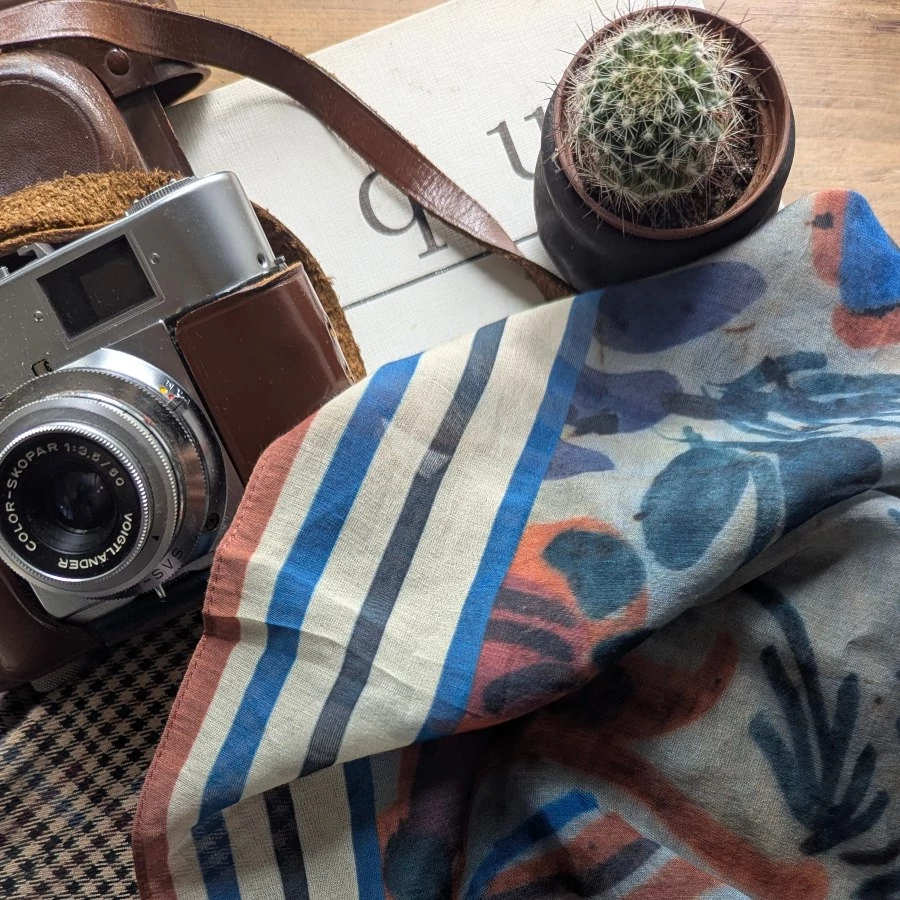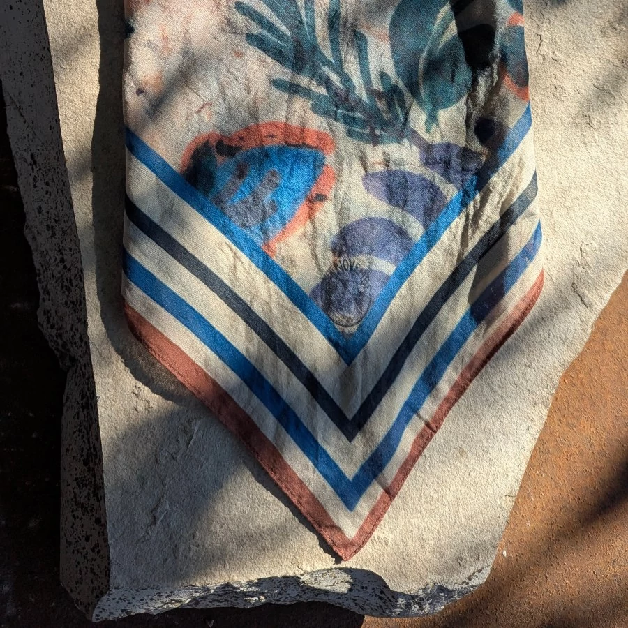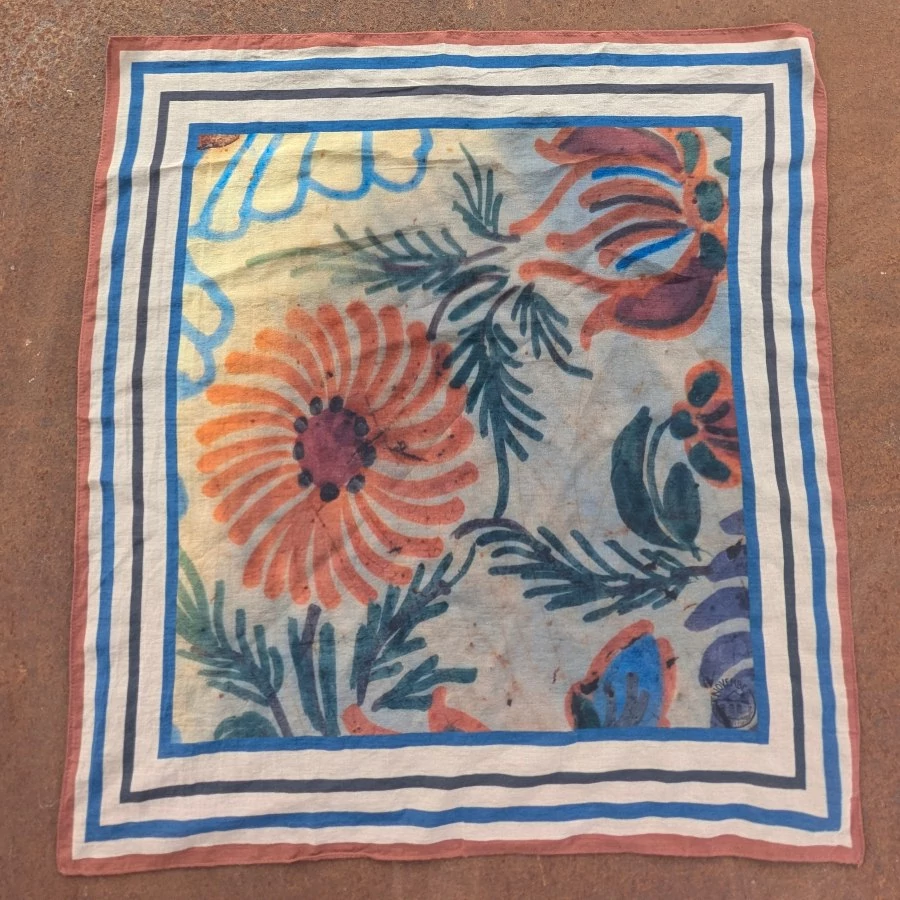 Ez az egyedi, limitált darabszámú pamut-selyem kendő egy régi hódmezővásárhelyi fazekasműhely kézzel festett tányérjának motívumát őrzi.