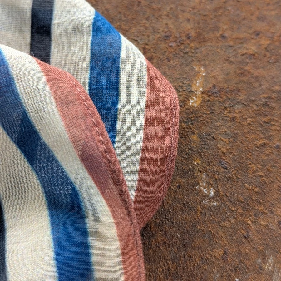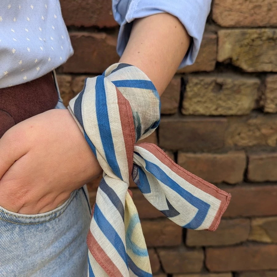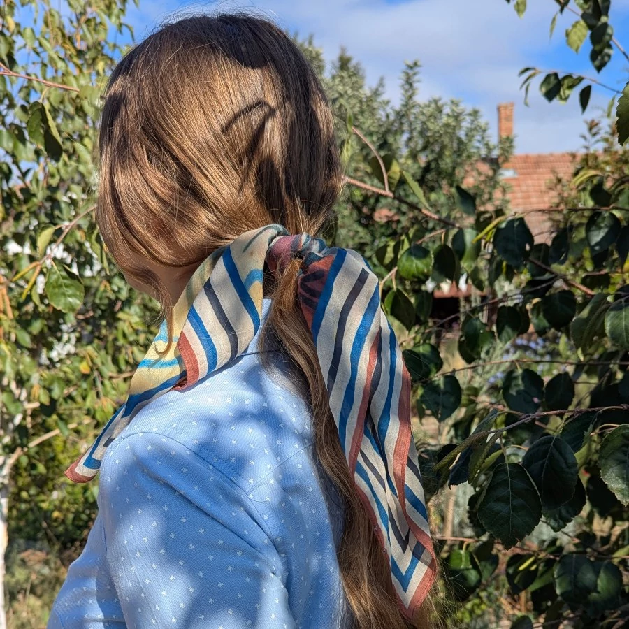 Kösd a hajadba, csuklódra, nyakadba vagy táskádra a kézzel festett virágok népi báját csíkos szegéllel körbeölelve - mintha a múlt és a jelen egy pillanatra összeérne az anyagon.