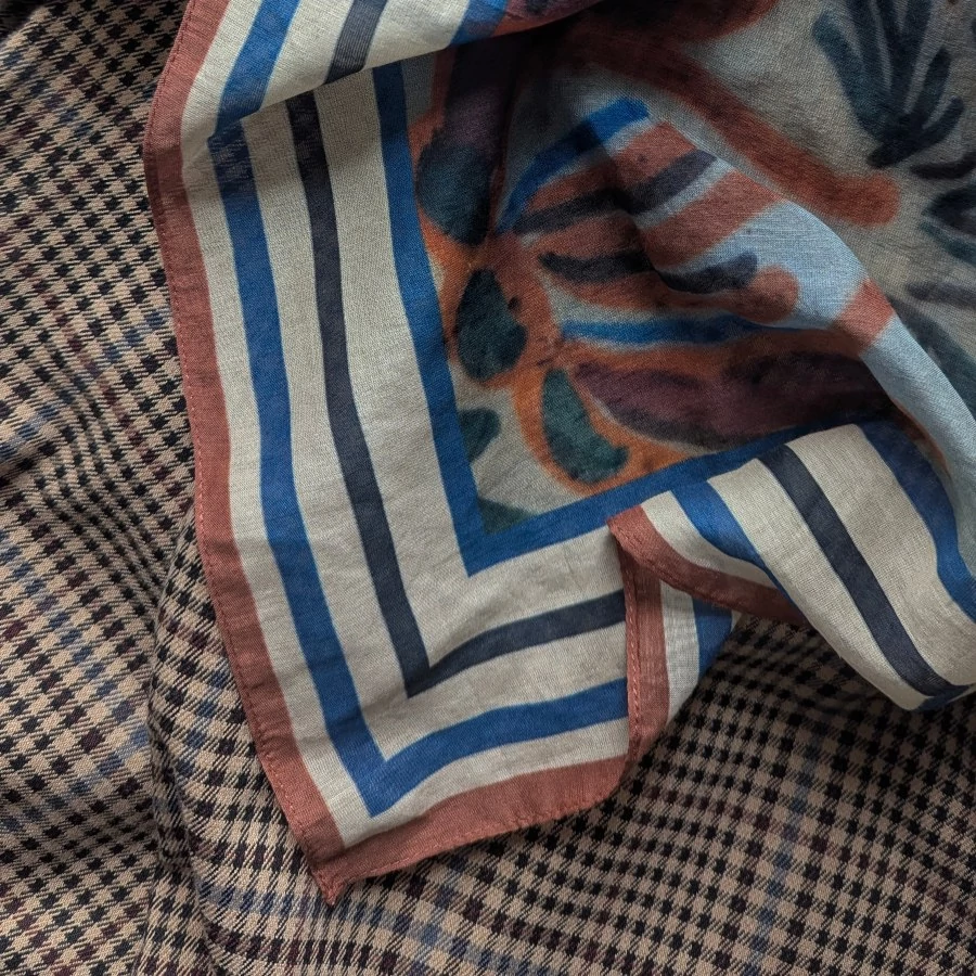 A 47×50 cm-es kendő anyaga 75% pamut és 25% selyem, így egyszerre puha és légies .